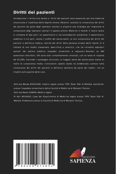 Introduzione: il diritto alla salute e i diritti dei pazienti sono essenziali per una medicina umanizzata e rispettosa della dignità umana. Obiettivi: valutare la conoscenza dei diritti dei pazienti da parte degli operatori sanitari e proporre una strategia per migliorare le conoscenze degli operatori sanitari in questo ambito. Materiali e metodi: Il nostro lavoro si compone di due parti: un questionario e raccomandazioni preventive. Il questionario, suddiviso in tre parti, valuta il profilo dei partecipanti, la loro conoscenza dei diritti dei pazienti e dell'etica medica, nonché dei diritti delle persone private della libertà. Si è trattato di uno studio trasversale, descrittivo e analitico, che ha coinvolto operatori sanitari del settore pubblico (ospedali universitari e regionali). Risultati: su 384 questionari distribuiti, 243 sono stati completamente compilati, con un tasso di risposta del 63,28%. Secondo il punteggio utilizzato, la maggior parte dei partecipanti aveva un livello di conoscenza medio. Conclusioni: questo studio ha evidenziato carenze nella conoscenza dei diritti dei pazienti e dell'etica sanitaria da parte dei medici, con un impatto sulla qualità delle cure.