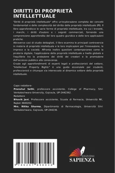 "Diritti di proprietà intellettuale" offre un'esplorazione completa dei concetti fondamentali e delle complessità del diritto della proprietà intellettuale (PI). Il libro approfondisce le varie forme di proprietà intellettuale, tra cui i brevetti, i marchi, i diritti d'autore e i segreti commerciali, fornendo una comprensione approfondita del loro quadro giuridico e delle loro applicazioni pratiche. Attraverso casi di studio dettagliati, il libro esamina le principali controversie in materia di proprietà intellettuale e le loro implicazioni per l'innovazione, le imprese e la società. Affronta inoltre questioni contemporanee come la pirateria digitale, l'applicazione della proprietà intellettuale a livello globale e l'equilibrio tra la protezione dei diritti dei creatori e la promozione dell'accesso pubblico alla conoscenza. Grazie agli approfondimenti di esperti legali e professionisti del settore, "Intellectual Property Rights" è una guida essenziale per studenti, professionisti e chiunque sia interessato al dinamico settore della proprietà intellettuale.