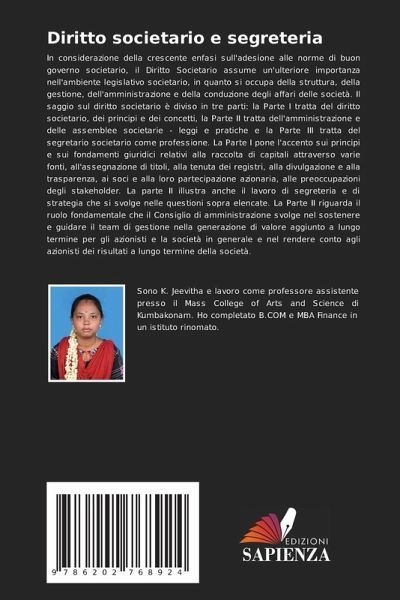 In considerazione della crescente enfasi sull'adesione alle norme di buon governo societario, il Diritto Societario assume un'ulteriore importanza nell'ambiente legislativo societario, in quanto si occupa della struttura, della gestione, dell'amministrazione e della conduzione degli affari delle società. Il saggio sul diritto societario è diviso in tre parti: la Parte I tratta del diritto societario, dei principi e dei concetti, la Parte II tratta dell'amministrazione e delle assemblee societarie - leggi e pratiche e la Parte III tratta del segretario societario come professione. La Parte I pone l'accento sui principi e sui fondamenti giuridici relativi alla raccolta di capitali attraverso varie fonti, all'assegnazione di titoli, alla tenuta dei registri, alla divulgazione e alla trasparenza, ai soci e alla loro partecipazione azionaria, alle preoccupazioni degli stakeholder. La parte II illustra anche il lavoro di segreteria e di strategia che si svolge nelle questioni sopra elencate. La Parte II riguarda il ruolo fondamentale che il Consiglio di amministrazione svolge nel sostenere e guidare il team di gestione nella generazione di valore aggiunto a lungo termine per gli azionisti e la società in generale e nel rendere conto agli azionisti dei risultati a lungo termine della società.