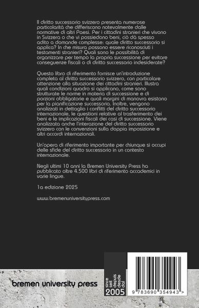 Il diritto successorio svizzero presenta numerose particolarità che differiscono notevolmente dalle normative di altri Paesi. Per i cittadini stranieri che vivono in Svizzera o che vi possiedono beni, ciò dà spesso adito a domande complesse: quale diritto successorio si applica? In che misura possono essere riconosciuti i testamenti stranieri? Quali sono le possibilità di organizzare per tempo la propria successione per evitare conseguenze fiscali o di diritto successorio indesiderate? Questo libro di riferimento fornisce un'introduzione completa al diritto successorio svizzero, con particolare attenzione alla situazione dei cittadini stranieri. Illustra quali condizioni quadro si applicano, come sono strutturate le norme in materia di successione e di porzioni obbligatorie e quali margini di manovra esistono per la pianificazione successoria. Inoltre, vengono analizzati in dettaglio i conflitti del diritto successorio internazionale, le questioni relative al trasferimento dei beni e le implicazioni fiscali dei casi di successione. Viene analizzata anche l'interazione del diritto successorio svizzero con le convenzioni sulla doppia imposizione e altri accordi internazionali. Un'opera di riferimento importante per chiunque si occupi delle sfide del diritto successorio in un contesto internazionale. Negli ultimi 10 anni la Bremen University Press ha pubblicato oltre 4.500 libri di riferimento accademici in varie lingue. 1a edizione 2025