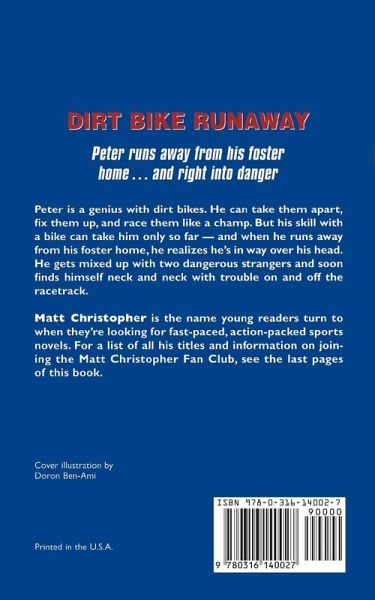 Peter runs away from his foster home ... and right into danger Peter is a genius with dirt bikes. He can take them apart, fix them up, and race them like a champ. But his skill with a bike can take him only so far - and when he runs away from his foster home, he realizes he's in way over his head. He gets mixed up with two dangerous strangers and soon finds himself neck and neck with trouble on and off the racetrack.