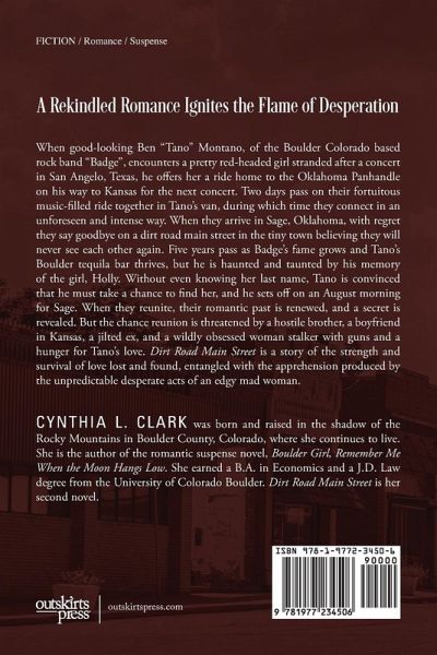 When good-looking Ben "Tano" Montano, of the Boulder Colorado based rock band "Badge", encounters a pretty red-headed girl stranded after a concert in San Angelo, Texas, he offers her a ride home to the Oklahoma Panhandle on his way to Kansas for the next concert. Two days pass on their fortuitous music-filled ride together in Tano's van, during which time they connect in an unforeseen and intense way. When they arrive in Sage, Oklahoma, with regret they say goodbye on a dirt road main street in the tiny town believing they will never see each other again. Five years pass as Badge's fame grows and Tano's Boulder tequila bar thrives, but he is haunted and taunted by his memory of the girl, Holly. Without even knowing her last name, Tano is convinced that he must take a chance to find her, and he sets off on an August morning for Sage. When they reunite, their romantic past is renewed, and a secret is revealed. But the chance reunion is threatened by a hostile brother, a boyfriend in Kansas, a jilted ex, and a wildly obsessed woman stalker with guns and a hunger for Tano's love. Dirt Road Main Street is a story of the strength and survival of love lost and found, entangled with the apprehension produced by the unpredictable desperate acts of an edgy mad woman.