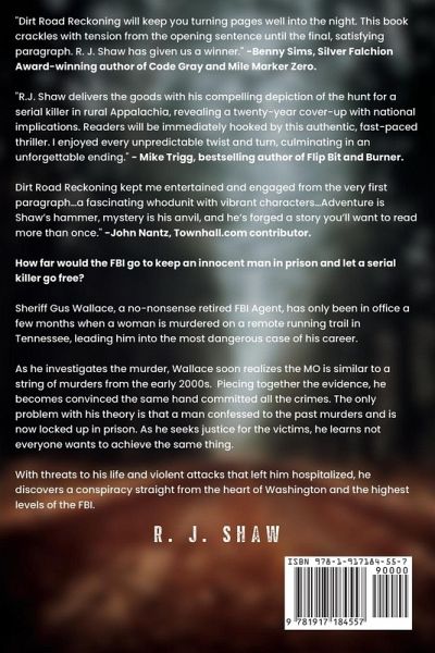 R.J. Shaw's DIRT ROAD RECKONING promises a fast and compelling read with a twisty, textured plot, smoothly built developments, complex characters, and a heavy dose of humor. - IndieReader (4.8 out of 5 stars) "At first, it seems that Shaw's story will be a simple murder investigation in which the main conflict is between local law enforcement and the feds. However, the story soon becomes far more complex, as Wallace must not only find a killer before they kill again but also save himself. As trouble arises from multiple sources, the action gets lively, with violence always close at hand....engaging whodunit with thriller elements" - Kirkus Reviews How far would the FBI go to keep an innocent man in prison and let a serial killer go free? When retired FBI Agent and newly elected Sheriff Gus Wallace takes office in a quiet Tennessee town, he expects a peaceful life. However, the brutal murder of a woman on a remote running trail shatters the tranquility. Wallace quickly realizes the murder's MO matches a series of killings from the early 2000s, crimes for which a man is already in prison. Determined to uncover the truth, Wallace's investigation reveals a conspiracy that reaches the highest levels of the FBI, endangering his life and exposing a plot that let a serial killer walk free for 20 years. As threats mount and violence looms, Wallace must navigate treacherous waters to achieve justice in this gripping, fast-paced thriller.