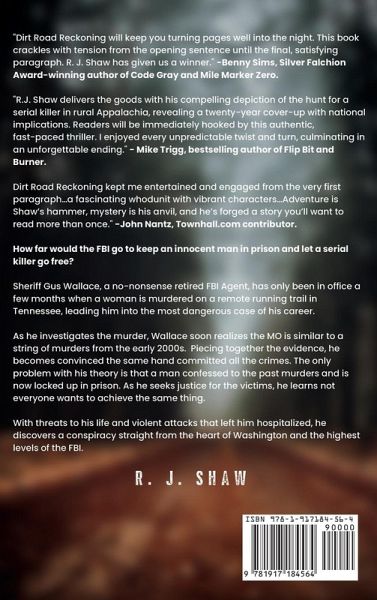 R.J. Shaw's DIRT ROAD RECKONING promises a fast and compelling read with a twisty, textured plot, smoothly built developments, complex characters, and a heavy dose of humor. - IndieReader (4.8 out of 5 stars) "At first, it seems that Shaw's story will be a simple murder investigation in which the main conflict is between local law enforcement and the feds. However, the story soon becomes far more complex, as Wallace must not only find a killer before they kill again but also save himself. As trouble arises from multiple sources, the action gets lively, with violence always close at hand....engaging whodunit with thriller elements" - Kirkus Reviews How far would the FBI go to keep an innocent man in prison and let a serial killer go free? When retired FBI Agent and newly elected Sheriff Gus Wallace takes office in a quiet Tennessee town, he expects a peaceful life. However, the brutal murder of a woman on a remote running trail shatters the tranquility. Wallace quickly realizes the murder's MO matches a series of killings from the early 2000s, crimes for which a man is already in prison. Determined to uncover the truth, Wallace's investigation reveals a conspiracy that reaches the highest levels of the FBI, endangering his life and exposing a plot that let a serial killer walk free for 20 years. As threats mount and violence looms, Wallace must navigate treacherous waters to achieve justice in this gripping, fast-paced thriller.
