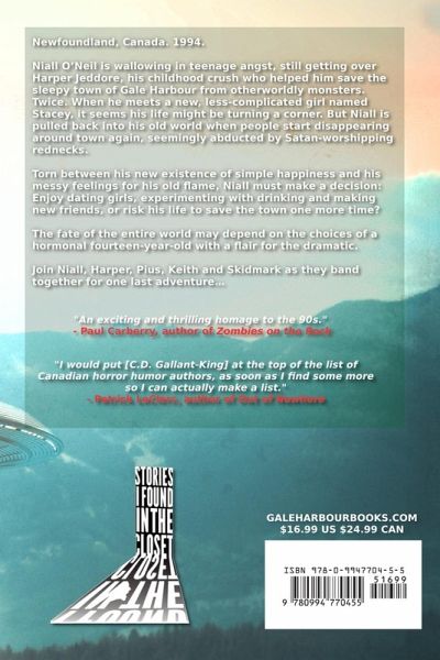 Newfoundland, Canada. 1994. Niall O'Neil is wallowing in teenage angst, still getting over Harper Jeddore, his childhood crush who helped him save the sleepy town of Gale Harbour from otherworldly monsters. Twice. When he meets a new, less-complicated girl named Stacey, it seems his life might be turning a corner. But Niall is pulled back into his old world when people start disappearing around town again, seemingly abducted by Satan-worshipping rednecks. Torn between his new existence of simple happiness and his messy feelings for his old flame, Niall must make a decision: Enjoy dating girls, experimenting with drinking and making new friends, or risk his life to save the town one more time? The fate of the entire world may depend on the choices of a hormonal fourteen-year-old with a flair for the dramatic. Join Niall, Harper, Pius, Keith and Skidmark as they band together for one last adventure...