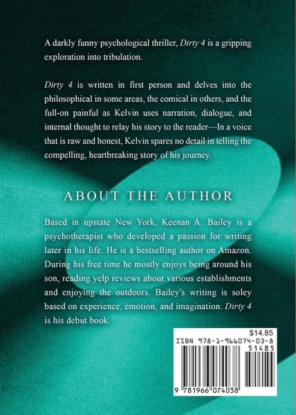 A darkly funny psychological thriller, Dirty 4 is a gripping exploration into tribulation. Dirty 4 is written in first person and delves into the philosophical in some areas, the comical in others, and the full-on painful as Kelvin uses narration, dialogue, and internal thought to relay his story to the reader-In a voice that is raw and honest, Kelvin spares no detail in telling the compelling, heartbreaking story of his journey.