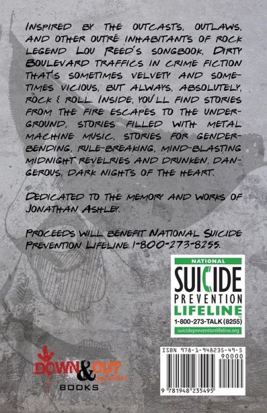 Inspired by the outcasts, outlaws, and other outré inhabitants of rock legend Lou Reed's songbook, Dirty Boulevard traffics in crime fiction that's sometimes velvety and sometimes vicious, but always, absolutely, rock & roll. Inside, you'll find stories from the fire escapes to the underground, stories filled with metal machine music, stories for gender-bending, rule-breaking, mind-blasting midnight revelries and drunken, dangerous, dark nights of the heart. Upcoming genre stars like Alison Gaylin team up with crime fiction legends such as Reed Farrel Coleman, along with Cate Holahan, Gabino Iglesias, Tony McMillen, and many of the most exciting new names in crime and horror fiction, who teach us that a perfect day is often anything but, that the power of positive drinking is a destructive force rarely contained, and that knock-down-drag-out drag queens are probably way tougher than you. Dedicated to the memory and works of Jonathan Ashley. Proceeds will benefit National Suicide Prevention Lifeline-1-800-273-8255. Edited by David James Keaton. Contributors: Jonathan Ashley, Rusty Barnes, Reed Farrel Coleman, Alison Gaylin, Lee Matthew Goldberg, Cate Holahan, Gabino Iglesias, David James Keaton, Erin Keaton, Ross E. Lockhart, Tony McMillen, Richard Neer, Chris Orlet, J. David Osborne, Rob Pierce, Eryk Pruitt and Patrick Wensink.