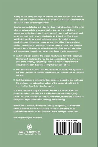 `From executive greed to criminal negligence, Dirty Business offers a masterful account of the great business debacles and disasters of modern times. A must read for all who want to understand - and prevent - corporate misconduct' - Michael Useem, University of PennsylvaniaDrawing on both theory and major case studies, this book provides a much-needed sociological and comparative analysis of the world of the manager in the context of misconduct within business organizations. Organizational misbehaviour and crime have been relatively neglected in the social sciences, particularly in business studies. Analyses have tended to be fragmentary, overly slanted towards narrow external views - such as those of legal control and public policy - and predominantly North American. Dirty Business rectifies this by offering a broad sociological perspective related to work, organizations and management, supported by a range of key international case studies. In developing his arguments, Maurice Punch draws on primary and secondary sources as well as his extensive personal experience of teaching and interacting with managers and in developing courses on crisis and disaster management. Part One critically examines the existing literature and dominant perspectives on organizational misbehaviour and crime. Punch challenges the view that businessmen break the law 'for the good of the company', highlighting a number of recent incidents in which executives have been discovered looting their own corporations. Part Two presents ten major cases which illustrate and amplify the arguments in the book. The cases are designed and presented in a form suitable for classroom teaching. Part Three offers a new organizational behaviour perspective that scrutinizes the irrational, even pathological, features of the managerial world, and the ways in which these distort decision-making.As a broad conceptual analysis of business deviance - its causes, effects and possible solutions - combined with a rich collection of case examples, Dirty Business will be an invaluable resource for practitioners, students and academics in management, organization studies, sociology and criminology.About the AuthorMaurice Punch, previously Professor of Sociology at Nijenrode, The Netherlands School of Business, is now an independent scholar and consultant. He has published extensively in the area of business ethics and organizational crime.