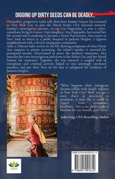 DIGGING UP DIRTY DEEDS CAN BE DEADLY... Once her small progressive radio station in Los Angeles was sold to a more conservative company, outspoken radio talk show host Sammy Greene returned to New York City to join the liberal Radio USA national network located in Astoria Queens. For the past four years she has been living with Alex Matsas, archeologist now executive director of the Vandis Foundation. As fundraiser for the only Romaniote Jewish Temple in New York, Alex is, in Sammy's eyes becoming too fond of rubbing elbows with the city's elite while she has maintained her passion for fighting for justice wherever she finds it. Sammy's investigative partner, ex-cop Gus Pappajohn, is now a cyber-consultant living in Greece. Gus's daughter, Ana Pappajohn, has turned her life around and is studying to become a Nurse Practitioner. Ana comes to New York to intern at a public hospital in Jackson Heights, a Queens neighborhood with a diverse immigrant community. After a Tibetan baby arrives in the ER showing symptoms of what Nurse Ana suspects is arsenic poisoning, the infant's mother is arrested for attempted murder. Determined to prove the mother's innocence, Ana launches her own investigation and turns to her father Gus and her friend Sammy for assistance. Together, the trio unravels a tangled web of corruption and criminal activity linked to two seemingly unrelated murders, and put their lives on the line to safeguard the residents of Jackson Heights.