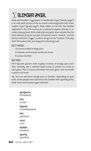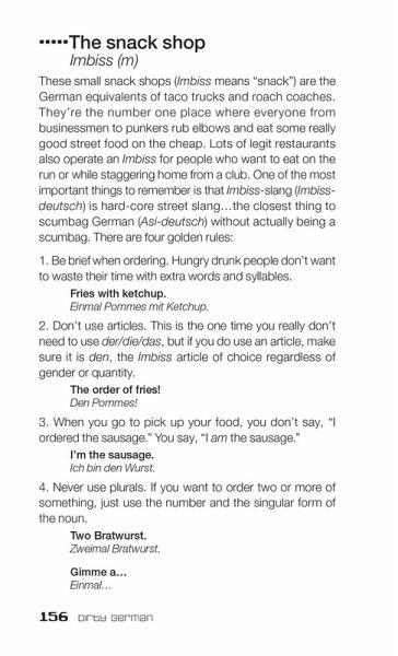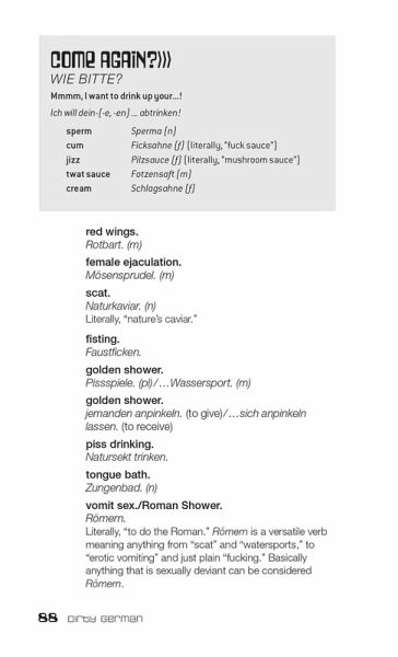 You already know enough German to get by, but you want to be able to tell those inside jokes, greet your friends in a laid-back manner, and casually pick someone up at a bar. From "what's up?" to "Wanna go home with me?" Dirty German will teach you how to speak like you're a regular on the streets of Berlin. But you'll also discover material that goes beyond a traditional phrasebook, including: * Hilarious insults * Provocative facts * Explicit swear words * Themed German cocktails * And more! Next time you're traveling to Germany, pick up this book, drop the textbook formality, and get dirty!