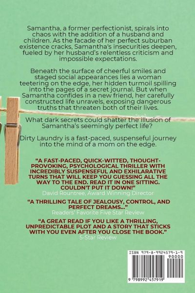 Dirty Laundry invites readers into the fragile world of Samantha, a former perfectionist whose once-orderly life spirals into chaos with the addition of a husband and children. As the facade of her perfect suburban existence cracks, Samantha's insecurities deepen, fueled by her husband's relentless criticism and impossible expectations. Beneath the surface of cheerful smiles and staged social appearances lies a woman teetering on the edge, her hidden turmoil spilling into the pages of a secret journal. But when Samantha confides in a new friend, her carefully constructed life unravels, exposing dangerous truths that threaten both their lives. What dark secrets could shatter the illusion of Samantha's seemingly perfect life? Dirty Laundry is a fast-paced, suspenseful journey into the mind of a mom on the edge.