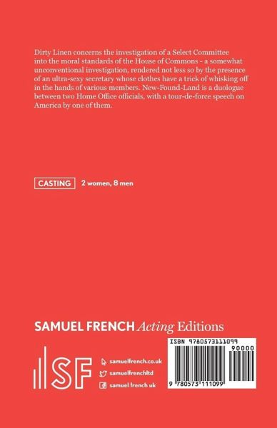 Dirty Linen concerns the investigation of a Select Committee into the moral standards of the House of Commons - a somewhat unconventional investigation, rendered not less so by the presence of an ultra-sexy secretary whose clothes have a trick of whisking off in the hands of various members. New-Found-Land is a duologue between two Home Office officials, with a tour-de-force speech on America by one of them.2 women, 8 men