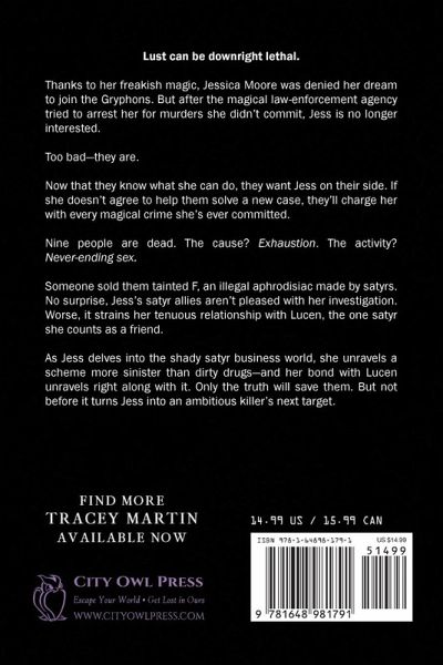 Lust can be downright lethal. Thanks to her freakish magic, Jessica Moore was denied her dream to join the Gryphons. But after the magical law-enforcement agency tried to arrest her for murders she didn't commit, Jess is no longer interested. Too bad-they are. Now that they know what she can do, they want Jess on their side. If she doesn't agree to help them solve a new case, they'll charge her with every magical crime she's ever committed. Nine people are dead. The cause? Exhaustion. The activity? Never-ending sex. Someone sold them tainted F, an illegal aphrodisiac made by satyrs. No surprise, Jess's satyr allies aren't pleased with her investigation. Worse, it strains her tenuous relationship with Lucen, the one satyr she counts as a friend. As Jess delves into the shady satyr business world, she unravels a scheme more sinister than dirty drugs-and her bond with Lucen unravels right along with it. Only the truth will save them. But not before it turns Jess into an ambitious killer's next target.