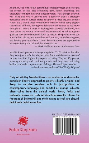 Dirty Martini by Natalie Shaw is an exuberant and anarchic pamphlet. Shaw's approach to poetry is highly original and likely to surprise readers with its juxtaposition of contemporary language and cocktail of strange subjects, often culled from the animal world. Fresh, funky and restlessly innovative, Dirty Martini flamboyantly follows the footsteps of Selima Hill and the feminine surreal into absurd, deliciously delirious realms.