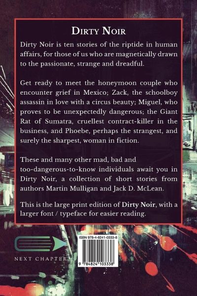 Dirty Noir is ten stories of the riptide in human affairs, for those of us who are magnetically drawn to the passionate, strange and dreadful. Get ready to meet the honeymoon couple who encounter grief in Mexico; Zack, the schoolboy assassin in love with a circus beauty; Miguel, who proves to be unexpectedly dangerous; the Giant Rat of Sumatra, cruellest contract-killer in the business, and Phoebe, perhaps the strangest, and surely the sharpest, woman in fiction. These and many other mad, bad and too-dangerous-to-know individuals await you in Dirty Noir, a collection of short stories from authors Martin Mulligan and Jack D. McLean. This is the large print edition of Dirty Noir, with a larger font / typeface for easier reading.
