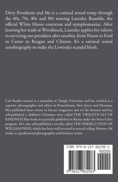 Dirty Presidents and Me is a comical sexual romp through the 60s, 70s, 80s and 90s starring Lauralee Bramble, the official White House courtesan and nymphomaniac. After learning her trade at Woodstock, Lauralee applies her talents to servicing one president after another, from Nixon to Ford to Carter to Reagan and Clinton. It's a satirical sexual autobiography to make the Lewinsky scandal blush.