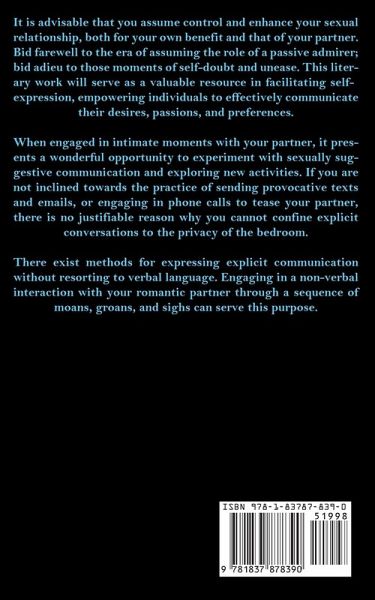 It is advisable that you assume control and enhance your sexual relationship, both for your own benefit and that of your partner. Bid farewell to the era of assuming the role of a passive admirer; bid adieu to those moments of self-doubt and unease. This literary work will serve as a valuable resource in facilitating self-expression, empowering individuals to effectively communicate their desires, passions, and preferences. When engaged in intimate moments with your partner, it presents a wonderful opportunity to experiment with sexually suggestive communication and exploring new activities. If you are not inclined towards the practice of sending provocative texts and emails, or engaging in phone calls to tease your partner, there is no justifiable reason why you cannot confine explicit conversations to the privacy of the bedroom. There exist methods for expressing explicit communication without resorting to verbal language. Engaging in a non-verbal interaction with your romantic partner through a sequence of moans, groans, and sighs can serve this purpose.