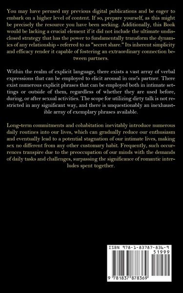 You may have perused my previous digital publications and be eager to embark on a higher level of content. If so, prepare yourself, as this might be precisely the resource you have been seeking. Additionally, this Book would be lacking a crucial element if it did not include the ultimate undisclosed strategy that has the power to fundamentally transform the dynamics of any relationship - referred to as "secret share." Its inherent simplicity and efficacy render it capable of fostering an extraordinary connection between partners. Within the realm of explicit language, there exists a vast array of verbal expressions that can be employed to elicit arousal in one's partner. There exist numerous explicit phrases that can be employed both in intimate settings or outside of them, regardless of whether they are used before, during, or after sexual activities. The scope for utilizing dirty talk is not restricted in any significant way, and there is unquestionably an inexhaustible array of exemplary phrases available. Long-term commitments and cohabitation inevitably introduce numerous daily routines into our lives, which can gradually reduce our enthusiasm and eventually lead to a potential stagnation of our intimate lives, making sex no different from any other customary habit. Frequently, such occurrences transpire due to the preoccupation of our minds with the demands of daily tasks and challenges, surpassing the significance of romantic interludes spent together.