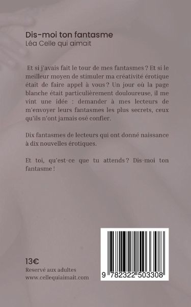 Et si j'avais fait le tour de mes fantasmes ? Et si le meilleur moyen de stimuler ma créativité érotique était de faire appel à vous ? Un jour où la page blanche était particulièrement douloureuse, il me vint une idée : demander à mes lecteurs de m'envoyer leurs fantasmes les plus secrets, ceux qu'ils n'ont jamais osé confier.Dix fantasmes de lecteurs qui ont donné naissance à dix nouvelles érotiques.Et toi, qu'est-ce que tu attends ? Dis-moi ton fantasme !