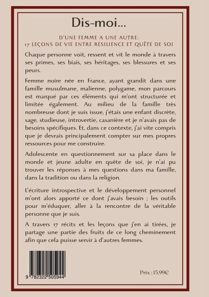 La quête de soi est une démarche que Mamou Ba a entreprise de longue date et qui a accompagné les étapes de sa construction en tant que femme. Manquant de repères et de modèles, elle a cheminé seule afin de poser des bases solides sur lesquelles ancrer sa vision du monde et de la vie dans tous ses aspects. A travers le partage de ces 17 leçons de vie, elle souhaite apporter à d'autres, ce dont elle a manqué et ainsi contribuer à ce que d'autres femmes puissent appréhender plus sereinement le long processus menant à l'alignement le plus parfait possible entre qui elles sont, ce qu'elles ressentent et ce qu'elles choisissent de faire de leur vie.