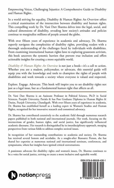Empowering Voices, Challenging Injustice: A Comprehensive Guide to Disability and Human Rights In a world striving for equality, Disability & Human Rights: An Overview offers a critical examination of the intersection between disability and human rights. This compelling work by Dr. Vani Datt Sharma delves into the legal, social, and cultural dimensions of disability, revealing how society's attitudes and policies continue to marginalize millions of people around the globe. With over fifteen years of experience in academia and advocacy, Dr. Sharma expertly navigates the complexities of disability rights, providing readers with a thorough understanding of the challenges faced by individuals with disabilities. From examining international human rights laws to exploring grassroots activism, this book uncovers the systemic barriers that prevent true inclusion and offers actionable insights for creating a more equitable world. Disability & Human Rights: An Overview is not just a book-it's a call to action. Whether you are a student, policymaker, or advocate, this essential guide will equip you with the knowledge and tools to champion the rights of people with disabilities and work towards a society where everyone is valued and respected. Explore. Engage. AdvocateThis book will inspire you to see disability rights not just as a legal issue, but as a fundamental human right that affects us all.