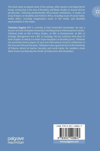 Chapter 1. Introduction Tafadzwa Rugoho.- Chapter 2. MOBILE MEDIA AND THE SIGN LANGUAGE OF ZIMBABWE'S DEAF COMMUNITY Martin Musengia, Chenjerai Muwanikib and Esther Musengic.- Chapter 3. Girlchild with Disability in Africa: Accessing the Role and opportunities of media for inclusive development. Olayinka Oluwakemi Adeniyi and Theophilus Michael Odaudu.- Chapter 4. MEDIA PORTRAYAL OF DISABILITY AND DISABILITY ISSUES IN NIGERIA: STEREOTYPES AND SOLUTIONS Okechukwu Chukwuma, & Omokhunu Julius.- Chapter 5. Marginalization and Misrepresentation: Framing Disability in Nigeria Olusola John Ogundola & Carol Liebler's.- Chapter 6. Unpacking Zimbabwean media's representations of Persons with disabilities (PWDs) vending-a critical social work perspective Tatenda Nhapi.- Chapter 7. Disability, Language and the Media in Zimbabwe: Perspectives of Media Industries towards People with Disabilities Phillipa Mutswanga).- Chapter 8. SOCIAL MEDIA AND DISABILITY POLITICS IN ZIMBABWE: Should We Celebrate 'liberation' or Resist a New Form of Social Oppression? Kudzai Shava &Isheunoziva Chinyoka.- Chapter 9. The Postcolonial Commodification of Gloria Huang's Black, Disabled Body: A Case Study in Media Ethics Gia Alexander.- Chapter 10. Medicine Murders, Witchcraft and Humanitarian Mercy: Western Media Portrayals of Albinism in Tanzania Giorgio Brocco.- Chapter 11. Inclusion of persons who use AAC in the media: A South African perspective Samuels, Alecia and Morwane, Refilwe Elizabeth.- Chapter 12. Book chapter Can web 2.0 salvage the gains of disability rights advocacy in Africa? By Nqobani Dube.- Chapter 13. The Voices of Persons with Sensory Impairment versus their Portrayal by Mass Media in Zimbabwe (By Phillipa Mutswanga).- Chapter 14. Disability in government-controlled media and legislation in Malawi 2012-2019.