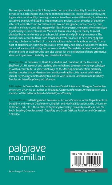 Notes on Contributors Introducing Disability and Social Theory; D.Goodley , B.Hughes & L.Davis PART I: CULTURES Civilizing Modernity and the Ontological Invalidation of Disabled People; B.Hughes Commodifying Autism: The Cultural Contexts of 'Disability' in the Academy; R.Mallett & K.Runswick-Cole Disability and the Majority World: A Neo-Colonial Approach; S.Grech Discourses of Disabled Peoples Organisations: Foucault, Bourdieu and Future Perspectives; T.Blackmore & S.Hodgkins PART II: BODIES Cyborgs, Cripples and iCrip: Reflections on the Contribution of Haraway to Disability Studies; D.Reeve Theory, Impairment, and Impersonal Singularities: Deleuze, Guattari and Agamben; J.Overboe The Body as the Problem of Individuality: A Phenomenological Disability Studies Approach; T.Titchkosky & R.Michalko Dancing with Disability: An Intersubjective Approach; E.McGrath PART III: SUBJECTIVITIES Nomadology and Subjectivity: Deleuze, Guattari and Critical Disability Studies; G.Roets & R.Braidotti Jacques Lacan + Paul Hunt = Psychoanalytic Disability Studies; D.Goodley Intellectual Disability Trouble: Foucault and Goffman on 'Challenging Behaviour'; K.Nunkoosing & M.Laurelut Stalking Ableism: Using Disability to Expose 'Abled' Narcissism; F.Campbell PART IV: COMMUNITIES Lave and Wenger, Communities of Practice and Disability; R.Lawthom Disability, Development and Postcolonialism; T.Chataika Engaging Disability with Postcolonial Theory; A.Ghai Recognition, Respect and Rights: Women with Disabilities in a Globalised World; C.Frohmader & H.Meekosha Conclusions; B.Hughes , D.Goodley & L.Davis Glossary