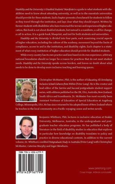 Mike Oliver: Foreword - Ben Whitburn/Christopher McMaster: Political Struggle for Inclusion in Higher Education - Travis Chi Wing Lau: Slowness, Disability, and Academic Productivity: The Need to Rethink Academic Culture - Denise Beckwith: Disability Advocacy Within the Ableist Environment of Academia - Fady Shanouda: The Violent Consequences of Disclosure ... and How Disabled and Mad Students Are Pushing Back - Leechin Heng: Negotiating the Space of Academia as a Disabled Student - Megan Zahneis: Disability Studies in Higher Education: Developing Identity and Community - Justin Freedman/Laura Jaffee/Katie Roquemore/Yosung Song/Hetsie Swartz Veitch: Beyond Compliance: Disabled Student Activism on Campus - George Low: Reasonable Adjustments - Zoie Sheets: But You Look Fine: Limitations of the Letter of Accommodation - Justin Harford: Universalizing International Exchange for Students with Disabilities - Mostafa Attia: The Need for Systemic Supports: Barriers Faced by Students with Disabilities in the Majority World - April B. Coughlin: "I Can't Even Reach the Waffle-maker!": Increasing Access for Students with Physical Disabilities on University Campuses - Georgia Geller: Assistance Dogs and Academia: Supporting the Dynamic Duo - Erin Pritchard: A Hierarchy of Impairments: The Absence of Body Size in Disability Accommodations Within Universities - Boopathi P./Muruganandan K.: Creating an Accessible and Resilient Environment Inside the Indian University - Katelin Anderson/Beth Rogers: Disabled by Society: Knowing and Invoking Your Rights - Karen McCall: Identifying and Eliminating Digital Barriers - Tafadzwa Rugoho: Navigating the Mud of Tertiary Education: The Experience of Disabled Students at Universities in the Global South - Maree Roche: Even the Delusional Can Learn: The Recognition of Diverse States of Mind, Knowing and Being - Matthew Bereza: From Classification to Culture: Learning Disabilities in Higher Education - Contributors.