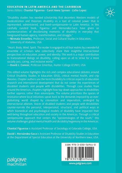This edited volume highlights the rich and complex educational debates around Critical Disability Studies in Education (DSE), critical mental health, and crip theories. Chapter authors use the term Dis/ability to criticize aspects of education research and international development that do not center the experiences of dis/abled students and people with dis/abilities. Through case studies from around the Americas, chapters highlight how top-down approaches to disabilities further oppress rather than emancipate. The volume prioritizes the spaces of resistance where local initiatives speak back to the demands imposed by an ever-globalizing world shaped by colonialism and imperialism, undergird by intersectional ableism. Voices of disabled students and people with dis/abilities counter-narrate the personal, interpersonal, structural, and political ways in which biomedical and psychological models of disability have impacted their well-being throughout education and society in the Americas. Through a critical sentipensante approach that centers the "epistemologies of the south," this volume challenges global mental health and dis/ability hegemony in the Americas.