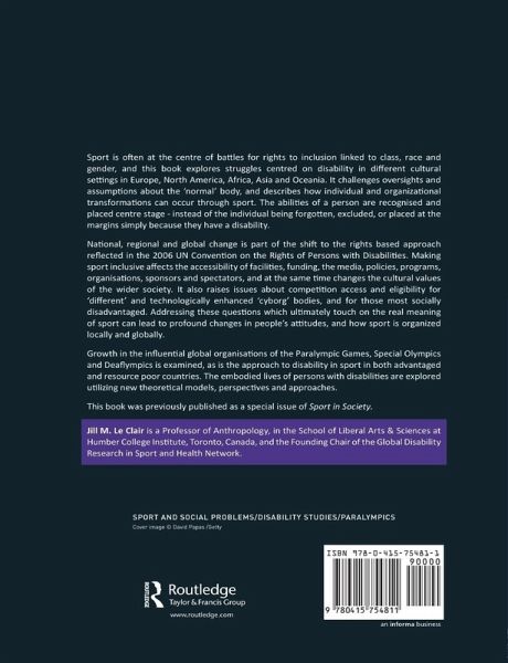 Sport is often at the centre of battles for rights to inclusion linked to class, race and gender, and this book explores struggles centred on disability in different cultural settings in Europe, North America, Africa, Asia and Oceania. It challenges oversights and assumptions about the 'normal' body, and describes how individual and organizational transformations can occur through sport. The abilities of a person are recognised and placed centre stage - instead of the individual being forgotten, excluded, or placed at the margins simply because they have a disability. National, regional and global change is part of the shift to the rights based approach reflected in the 2006 UN Convention on the Rights of Persons with Disabilities. Making sport inclusive affects the accessibility of facilities, funding, the media, policies, programs, organisations, sponsors and spectators, and at the same time changes the cultural values of the wider society. It also raises issues about competition access and eligibility for 'different' and technologically enhanced 'cyborg' bodies, and for those most socially disadvantaged. Addressing these questions which ultimately touch on the real meaning of sport can lead to profound changes in people's attitudes, and how sport is organized locally and globally. Growth in the influential global organisations of the Paralympic Games, Special Olympics and Deaflympics is examined, as is the approach to disability in sport in both advantaged and resource poor countries. The embodied lives of persons with disabilities are explored utilizing new theoretical models, perspectives and approaches. This book was previously published as a special issue of Sport in Society.