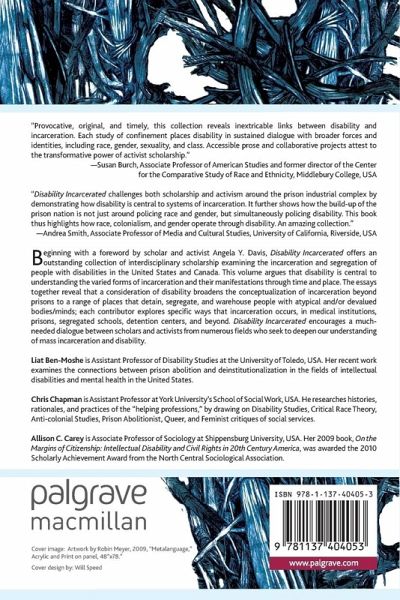 "The essays in Disability Incarcerated demonstrate that racialized and disabled bodies are now, and historically have been, policed in various and complex ways, causing a disproportionate number of people with disabilities to be confined in carceral spaces, whether in institutions or in prisons. The collection compellingly argues for a deeper examination of the interlocking oppressions that have caused othered bodies specifically, disabled, working-class, minority, immigrant, terrorist, and displaced bodies to be watched, controlled, and contained by the prison-industrial complex. . . Disability Incarcerated offers readers a powerful critique of neoliberalism and its exploitation of non-normative bodies, and it certainly has primed the path for future work that bridges critical prison studies and critical disability studies." - Disability Studies Quarterly