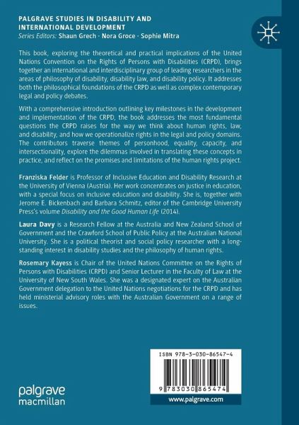 Franziska Felder is Professor of Inclusive Education and Disability Research at the University of Vienna (Austria). Her work concentrates on justice in education, with a special focus on inclusive education and disability. She is, together with Jerome E. Bickenbach and Barbara Schmitz, Editor of the Cambridge University Press's volume Disability and the Good Human Life (2014). Laura Davy is a Research Fellow at the Australia and New Zealand School of Government and the Crawford School of Public Policy at the Australian National University. She is a political theorist and social policy researcher with a longstanding interest in disability studies and the philosophy of human rights. Rosemary Kayess is Chair of the United Nations Committee on the Rights of Persons with Disabilities (CRPD) and Senior Lecturer in the Faculty of Law at the University of New South Wales. She was a designated expert on the Australian Government delegation to the United Nations negotiations for the CRPD and has held ministerial advisory roles with the Australian Government on a range of issues.
