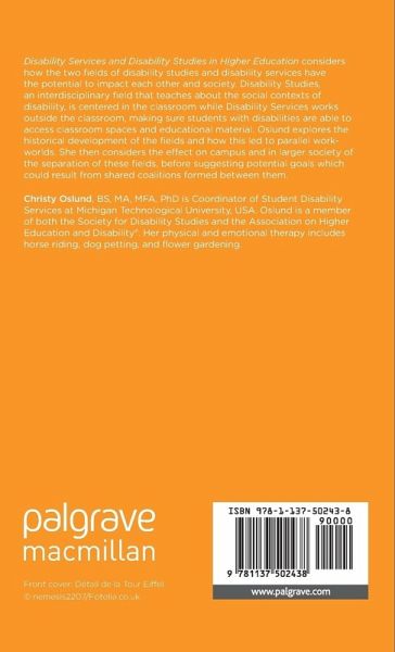 Disability Services and Disability Studies in Higher Education considers how the two fields of disability studies and disability services in institutions of higher education impact each other. Disability Studies is centered in the classroom, an interdisciplinary field that teaches about the social contexts of disability, while Disability Services works outside the classroom, making sure students with disabilities are able to access classroom spaces and educational material. Oslund explores the effect of the services on the larger societies in which they are located, students who encounter the respective fields, and those who self-identify as disabled or have an identity of disability posited on them by the society in which they live.