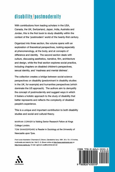 With contributions from leading scholars in the USA, Canada, the UK, Switzerland, Japan, India, Australia and Jordan, Disability and Postmodernity is the first book to study disability within the context of the "postmodern" world of the twenty-first century. Organized into three sections, the volume opens with an exploration of theoretical perspectives, looking especially at phenomenology, at the body, and at concepts of difference and identity. The second section deals with culture, discussing aesthetics, narrative, film, architecture and design, while the final section explores social practice, including chapters on disabled childrens' perspectives, sexual identity and "madness and mental distress".The collection creates a bridge between social science perspectives on disability (predominant in disability studies in the UK for example) and humanities perspectives (which dominate the US approach). The authors aim to demystify the concept of postmodernity and to suggest ways in which it fosters a holistic approach to the study of disability that better represents and reflects the complexity of disabled people's experience. This is a unique and important contribution to both disability studies and social and cultural theory.
