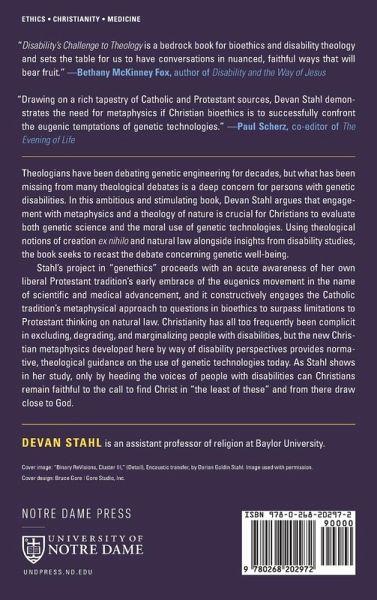 This book uses insights from disability studies to understand in a deeper way the ethical implications that genetic technologies pose for Christian thought. Theologians have been debating genetic engineering for decades, but what has been missing from many theological debates is a deep concern for persons with genetic disabilities. In this ambitious and stimulating book, Devan Stahl argues that engagement with metaphysics and a theology of nature is crucial for Christians to evaluate both genetic science and the moral use of genetic technologies, such as human genetic engineering, gene therapy, genetic screenings, preimplantation genetic diagnosis, and gene editing. Using theological notions of creation ex nihilo and natural law alongside insights from disability studies, the book seeks to recast the debate concerning genetic well-being. Following the work of Stanley Hauerwas, Stahl proposes the church as the locus for reimagining disability in a way that will significantly influence the debates concerning genetic therapies. Stahl's project in "genethics" proceeds with an acute awareness of her own liberal Protestant tradition's early embrace of the eugenics movement in the name of scientific and medical advancement, and it constructively engages the Catholic tradition's metaphysical approach to questions in bioethics to surpass limitations to Protestant thinking on natural law. Christianity has all too frequently been complicit in excluding, degrading, and marginalizing people with disabilities, but the new Christian metaphysics developed here by way of disability perspectives provides normative, theological guidance on the use of genetic technologies today. As Stahl shows in her study, only by heeding the voices of people with disabilities can Christians remain faithful to the call to find Christ in "the least of these" and from there draw close to God. This book will be of interest to scholars in Christian ethics, bioethics, moral theology, and practical theology.