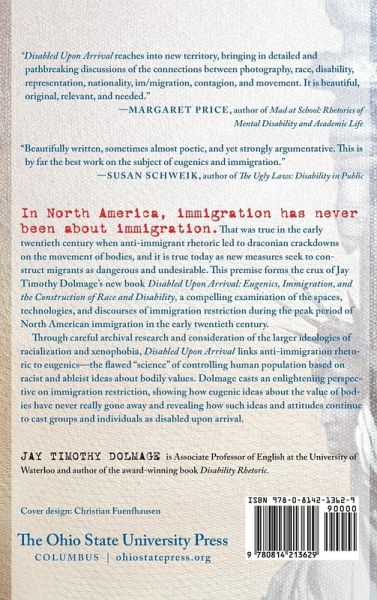 In North America, immigration has never been about immigration. That was true in the early twentieth century when anti-immigrant rhetoric led to draconian crackdowns on the movement of bodies, and it is true today as new measures seek to construct migrants as dangerous and undesirable. This premise forms the crux of Jay Timothy Dolmage's new book Disabled Upon Arrival: Eugenics, Immigration, and the Construction of Race and Disability, a compelling examination of the spaces, technologies, and discourses of immigration restriction during the peak period of North American immigration in the early twentieth century. Through careful archival research and consideration of the larger ideologies of racialization and xenophobia, Disabled Upon Arrival links anti-immigration rhetoric to eugenics-the flawed "science" of controlling human population based on racist and ableist ideas about bodily values. Dolmage casts an enlightening perspective on immigration restriction, showing how eugenic ideas about the value of bodies have never really gone away and revealing how such ideas and attitudes continue to cast groups and individuals as disabled upon arrival.
