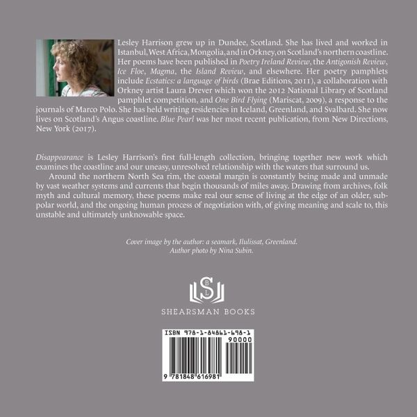 Disppearance is Lesley Harrison’s first full-length collection, bringing together new work which examines the coastline and our uneasy, unresolved relationship with the waters that surround us. Around the northern North Sea rim, the coastal margin is constantly being made and unmade by vast weather systems and currents that begin thousands of miles away. Drawing from archives, folk myth and cultural memory, these poems make real our sense of living at the edge of an older, sub-polar world, and the ongoing human process of negotiation with, of giving meaning and scale to, this unstable and ultimately unknowable space.