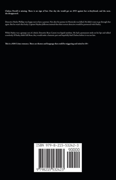 Chelsea Powell is missing. There is no sign of her. One day she would get an AVO against her ex-boyfriend, and the next, she disappeared. Detective Harley Phillips was happy not to have a partner. Not after his partner in Homicide was killed. He didn't want to go through that again. But he wasn't that lucky. Captain Hayden Jefferson insisted that their newest detective would be partnered with Harley. While Harley was a grumpy son of a bitch, Detective Beau Carson was liquid sunshine. He had a permanent smile on his lips and talked ceaselessly. If Harley didn't kill Beau, they would make a fantastic pair and hopefully find Chelsea before it was too late. This is a MM Crime romance. There are themes and language that could be triggering and suited to 18+