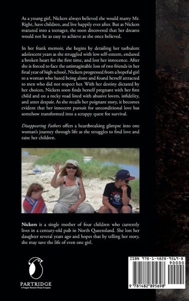 As a young girl, Nickers always believed she would marry Mr. Right, have children, and live happily ever after. But as Nickers matured into a teenager, she soon discovered that her dreams would not be as easy to achieve as she once believed. In her frank memoir, she begins by detailing her turbulent adolescent years as she struggled with low self-esteem, endured a broken heart for the first time, and lost her innocence. After she is forced to face the unimaginable loss of two friends in her final year of high school, Nickers progressed from a hopeful girl to a woman who hated being alone and found herself attracted to men who did not respect her. With her destiny dictated by her choices, Nickers soon finds herself pregnant with her first child and on a rocky road lined with abusive lovers, infidelity, and utter despair. As she recalls her poignant story, it becomes evident that her innocent pursuit for unconditional love has somehow transformed into a scrappy quest for survival. Disappearing Fathers offers a heartbreaking glimpse into one woman's journey through life as she struggles to find love and raise her children.