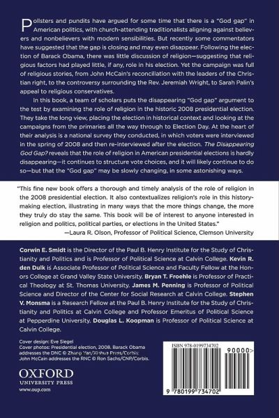 After the reelection of George W. Bush in 2004, the "God Gap" became a hotly debated political issue. Religious voters were seen as the key to Bush's victory, and Democrats began scrambling to reach out to them. Four years later, however, with the economy in a tailspin on election day, religion barely seemed to register on people's radar screens. In this book, a team of well-regarded scholars digs deeper to examine the role religion played in the 2008 campaign. They take a long view, placing the election in historical context and looking at the campaign as a whole, from the primaries through all the way through election day. At the heart of their analysis is data gleaned from a national survey conducted by the authors, in which voters were interviewed in the spring of 2008 and then re-interviewed after the election.