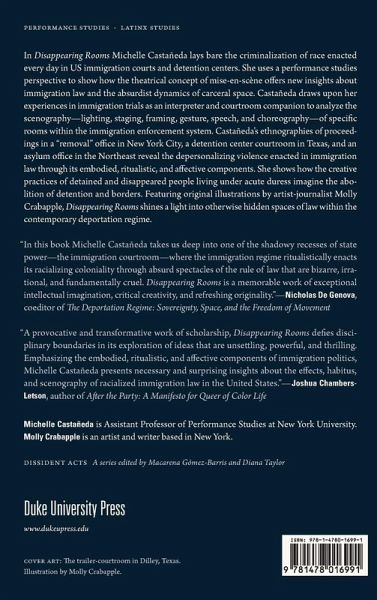 In Disappearing Rooms Michelle Castañeda lays bare the criminalization of race enacted every day in US immigration courts and detention centers. She uses a performance studies perspective to show how the theatrical concept of mise-en-scène offers new insights about immigration law and the absurdist dynamics of carceral space. Castañeda draws upon her experiences in immigration trials as an interpreter and courtroom companion to analyze the scenography-lighting, staging, framing, gesture, speech, and choreography-of specific rooms within the immigration enforcement system. Castañeda's ethnographies of proceedings in a "removal" office in New York City, a detention center courtroom in Texas, and an asylum office in the Northeast reveal the depersonalizing violence enacted in immigration law through its embodied, ritualistic, and affective components. She shows how the creative practices of detained and disappeared people living under acute duress imagine the abolition of detention and borders. Featuring original illustrations by artist-journalist Molly Crabapple, Disappearing Rooms shines a light into otherwise hidden spaces of law within the contemporary deportation regime. Duke University of Press Scholars of Color First Book Award Recipient