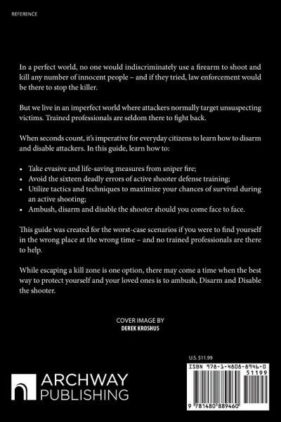 In a perfect world, no one would indiscriminately use a firearm to shoot and kill any number of innocent people - and if they tried, law enforcement would be there to stop the killer. But we live in an imperfect world where attackers normally target unsuspecting victims. Trained professionals are seldom there to fight back. When seconds count, it's imperative for everyday citizens to learn how to disarm and disable attackers. In this guide, learn how to: ¿ Take evasive and life-saving measures from sniper fire; ¿ Avoid the sixteen deadly errors of active shooter defense training; ¿ Utilize tactics and techniques to maximize your chances of survival during an active shooting; ¿ Ambush, disarm and disable the shooter should you come face to face. This guide was created for the worst-case scenarios if you were to find yourself in the wrong place at the wrong time - and no trained professionals are there to help. While escaping a kill zone is one option, there may come a time when the best way to protect yourself and your loved ones is to ambush, Disarm and Disable the shooter.