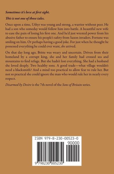 Sometimes it's love at first sight. This is not one of those tales. Once upon a time, Uthyr was young and strong, a warrior without peer. He had a son who someday would follow him into battle. A beautiful new wife to ease the pain of losing his first one. And he'd just wrested power from his abusive father to ensure his people's safety from Saxon invaders. Fortune was smiling on him. Or perhaps having a good joke. For just when he thought he possessed everything he could ever want, she arrived. ~ On that day long ago, Britte was weary and uncertain. Driven from their homeland by a corrupt king, she and her family had crossed sea and mountains to find refuge. But she hadn't lost everything. She had a husband she loved deeply. Two healthy sons. A good trade-what village wouldn't need a blacksmith? And a mind too practical to allow fear to rule her. But not so practical she could ignore the man who would rule her in nearly every respect. DISARMED BY DESIRE is the 7th novel of the SONS OF BRITAIN series. Tropes: enemies to lovers, unrequited love, hurt/comfort, slow burn Content Notes: This story involves depictions/descriptions of abuse of power; pregnancy and childbirth; death in childbirth; battle violence; injuries including limb loss; ableism; terminal illness; spousal death; grief; homophobia; drugging of another person; murder. While this story does not involve physical cheating, the emotions of its protagonists are complex and conflicted.