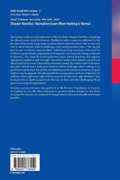 "The book is comprised of 13 chapters ... contributed by individual authors and divided into two sections. ... It will serve to shape and focus future research and debate. ... This is a volume that will be of value to those interested in exploring the acceptable ethical bounds of conduct during times of disaster. Such individuals should include not only ethicists but also public health professionals, humanitarian aid workers, and academics who might conduct research in a disaster setting." (James D. Hearn, Bioethical Inquiry, Vol. 12, 2015)