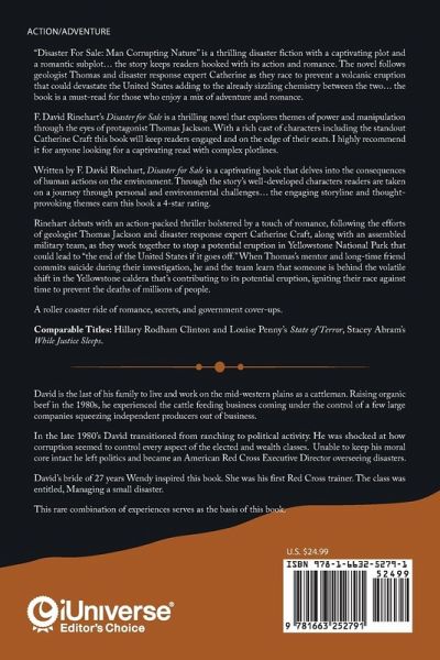 When Yellowstone's Super Volcano threatens eruption wiping out the United States, Dr. Thomas Jackson, the world's foremost expert in the geology of aquifers and underground water movements is called upon to lead the frantic effort to reverse the trends hopefully avoiding an eruption. Joined by internationally known disaster response expert, Catherine Craft, who has just finished her rotation leading the massive response to the eruption of Sicily's Mt. Etna and the initial test of her designed and personally-funded revolution in response housing and system. Forged together from two different worlds, Thomas and Catherine encounter personal betrayals and losses as they lead an elite team, uncovering the sinister years' old plot of activating eco-weapons designed to destroy nature and mankind for corporate gain. Despite the huge forces and potential losses in play, Thomas and Catherine immediately connect and navigate unexpected new love as the world closes in on them. They lean on each other as betrayal comes from directions never imagined, from greedy corporations to corrupt government officials to their own twisted families.