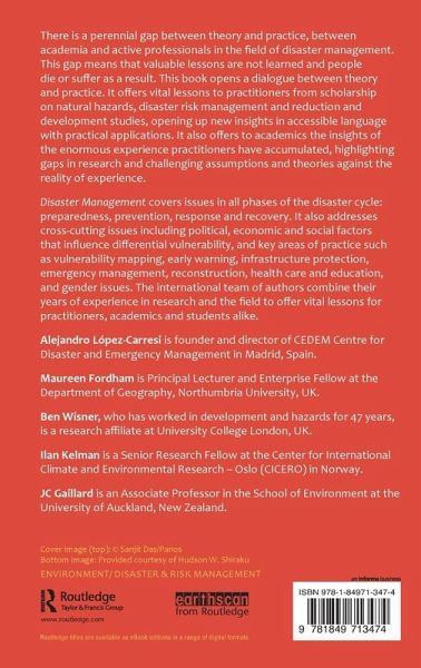 There is a perennial gap between theory and practice, between academia and active professionals in the field of disaster management. This gap means that valuable lessons are not learned and people die or suffer as a result. This book opens a dialogue between theory and practice. It offers vital lessons to practitioners from scholarship on natural hazards, disaster risk management and reduction and developments studies, opening up new insights in accessible language with practical applications. It also offers to academics the insights of the enormous experience practitioners have accumulated, highlighting gaps in research and challenging assumptions and theories against the reality of experience. Disaster Management covers issues in all phases of the disaster cycle: preparedness, prevention, response and recovery. It also addresses cross-cutting issues including political, economic and social factors that influence differential vulnerability, and key areas of practice such as vulnerability mapping, early warning, infrastructure protection, emergency management, reconstruction, health care and education, and gender issues. The team of international authors combine their years of experience in research and the field to offer vital lessons for practitioners, academics and students alike.