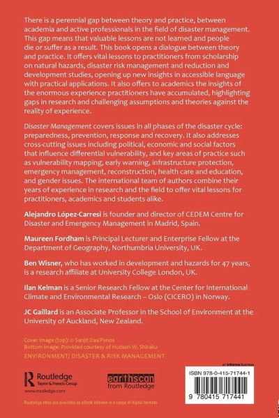 There is a perennial gap between theory and practice, between academia and active professionals in the field of disaster management. This gap means that valuable lessons are not learned and people die or suffer as a result. This book opens a dialogue between theory and practice. It offers vital lessons to practitioners from scholarship on natural hazards, disaster risk management and reduction and developments studies, opening up new insights in accessible language with practical applications. It also offers to academics the insights of the enormous experience practitioners have accumulated,…mehr