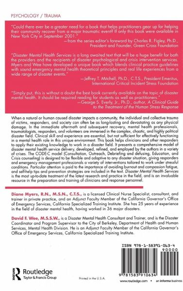 Part I: Disaster Concepts and Roles. Disasters and Human Reactions. The Role of Mental Health Professionals in Disaster. Selection, Training, and Preparation of Disaster Mental Health Workers. Part II: Disaster Mental Health Services, Programs, and Workers. Disaster Mental Health Programs and Models of Actions. Stress Management and Prevention of Compassion Fatigue for Psychotraumatologists During Disaster. Psychological Debriefing in Large-scale Disasters. Support Groups in Disaster Mental Health Programs. Part III: Disaster Mental Health Services in the Millennium. Case Example - The Oklahoma City Bombing. Trauma Therapies. Implications for Disaster Mental Health Services in the Millennium.