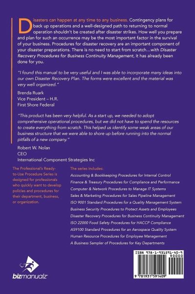 Be prepared for any emergency or disaster such as fire or floods with this authoritative disaster recovery guide. It has step-by-step information to assist with quickly producing an emergency and disaster management plan. While most businesses have insurance, it could take 90 days or longer to process a claim. Plus, how much business will you lose while you are trying to re-open your doors? Disasters can strike any business at any time. The key to successful disaster recovery is to have an emergency plan in place before a disaster strikes. Disaster Recovery Procedures for Business Continuity Management is written by experts, and based on proven models and thoroughly researched best practices. Designed for security managers and public safety officials, operations directors, executives, auditors, and business owners, it can help companies of all sizes and types be prepared for incidents like fires, floods, tornadoes and hurricanes, power outages, theft and violence, and many more. Being prepared is one of the most important things you can do to ensure the survival of your business should disaster strike. And there is no need to start from scratch..with Disaster Recovery Procedures for Business Continuity Management it has already been done for you.