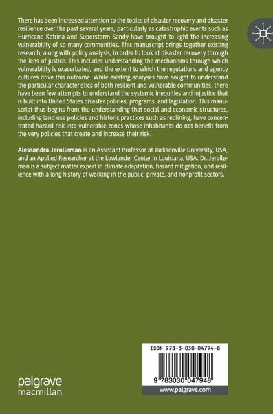 There has been increased attention to the topics of disaster recovery and disaster resilience over the past several years, particularly as catastrophic events such as Hurricane Katrina and Superstorm Sandy have brought to light the increasing vulnerability of so many communities. This manuscript brings together existing research, along with policy analysis, in order to look at disaster recovery through the lens of justice. This includes understanding the mechanisms through which vulnerability is exacerbated, and the extent to which the regulations and agency cultures drive this outcome. While existing analyses have sought to understand the particular characteristics of both resilient and vulnerable communities, there have been few attempts to understand the systemic inequities and injustice that is built into United States disaster policies, programs, and legislation. This manuscript thus begins from the understanding that social and economic structures, including land use policies andhistoric practices such as redlining, have concentrated hazard risk into vulnerable zones whose inhabitants do not benefit from the very policies that create and increase their risk.